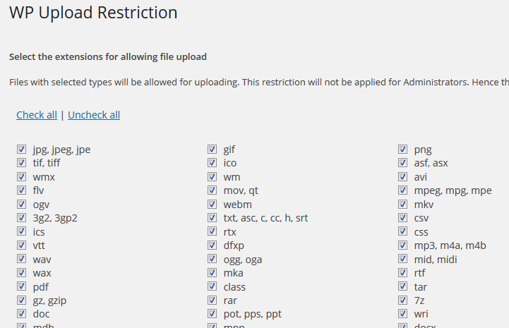WordPress allows user to upload various types of files using the media upload functionality. There is no visible way for restricting users from uploading files of one or more file types. However you can do this using filters. So, I decided to create a plugin which will provide user interface for selecting which files the users will be able to upload. WP Upload Restriction is the plugin which allows administrators to choose the files types and restricts users from uploading files other than the selected types. It’s a very simple, easy-to-use, yet powerful plugin.
